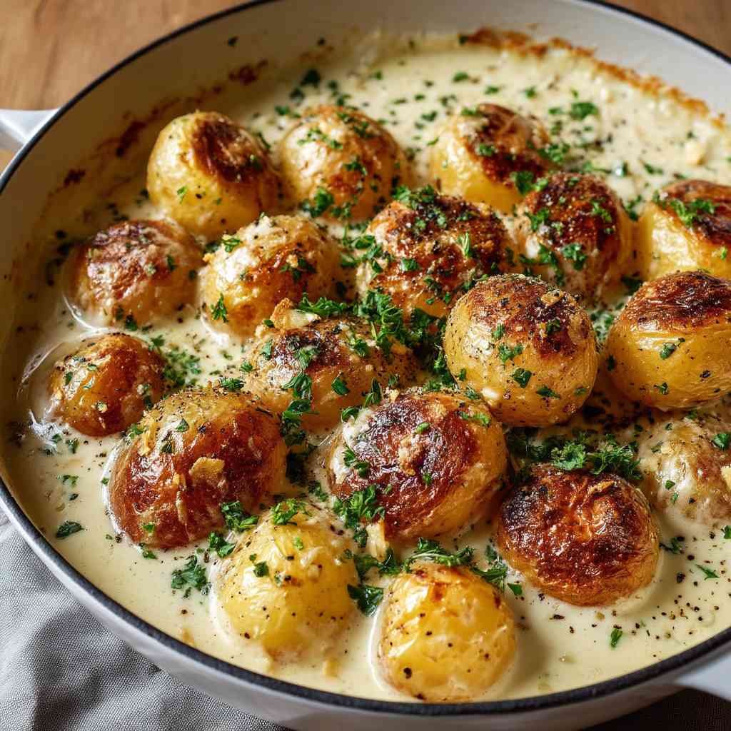 A succulent dish of baby potatoes smothered in velvety garlic sauce awaits, promising comfort food perfection that will leave you craving more.