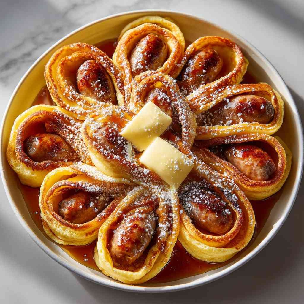 Indulge in fluffy pancakes wrapped around savory sausages for a breakfast that combines sweet and salty in every delicious bite.